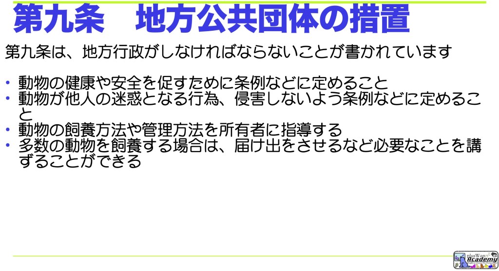 地方公共団体は、動物の健康及び安全を保持するとともに、動物が人に迷惑を及ぼすことのないようにするため、条例で定めるところにより、動物の飼養及び保管について動物の所有者又は占有者に対する指導をすること、多数の動物の飼養及び保管に係る届出をさせることその他の必要な措置を講ずることができる。