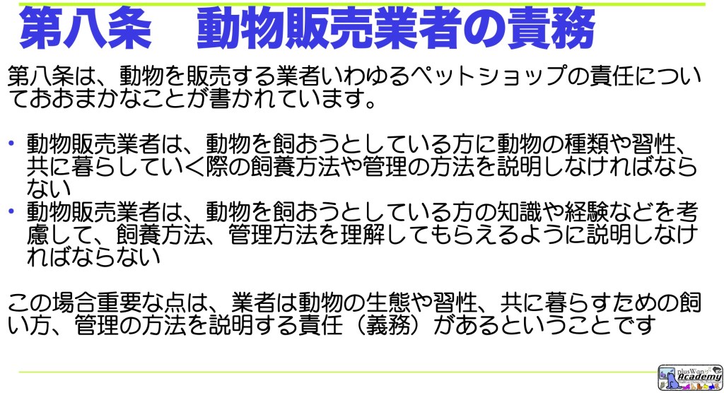 動物の販売を業として行う者は、当該販売に係る動物の購入者に対し、当該動物の種類、習性、供用の目的等に応じて、その適正な飼養又は保管の方法について、必要な説明をしなければならない。