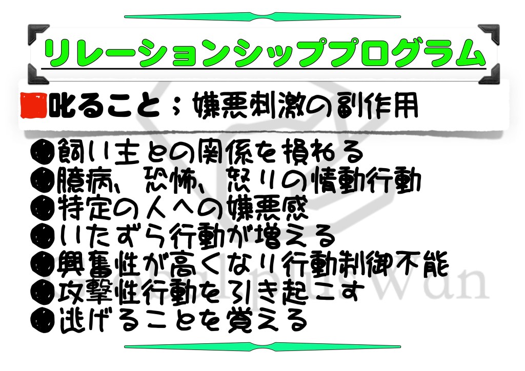 叱るという行為はタイミングと強さがポイントとなり、実際なかなか効果的に成果をあげられず逆に副作用的な行動を誘発してしまうことになってしまいます。