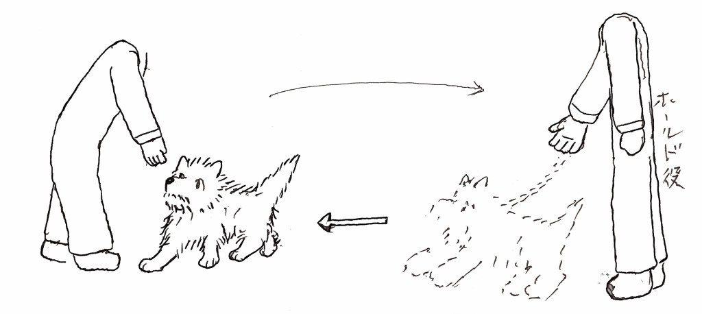 ○この方法はペアで対面である程度離れます。いぬにはリードをつけてホールド役の人のところまでいぬを連れていきリードを渡します、少し離れていぬを呼び来たらフードを一粒与えてから褒め言葉を言いながら頭などを撫でます。