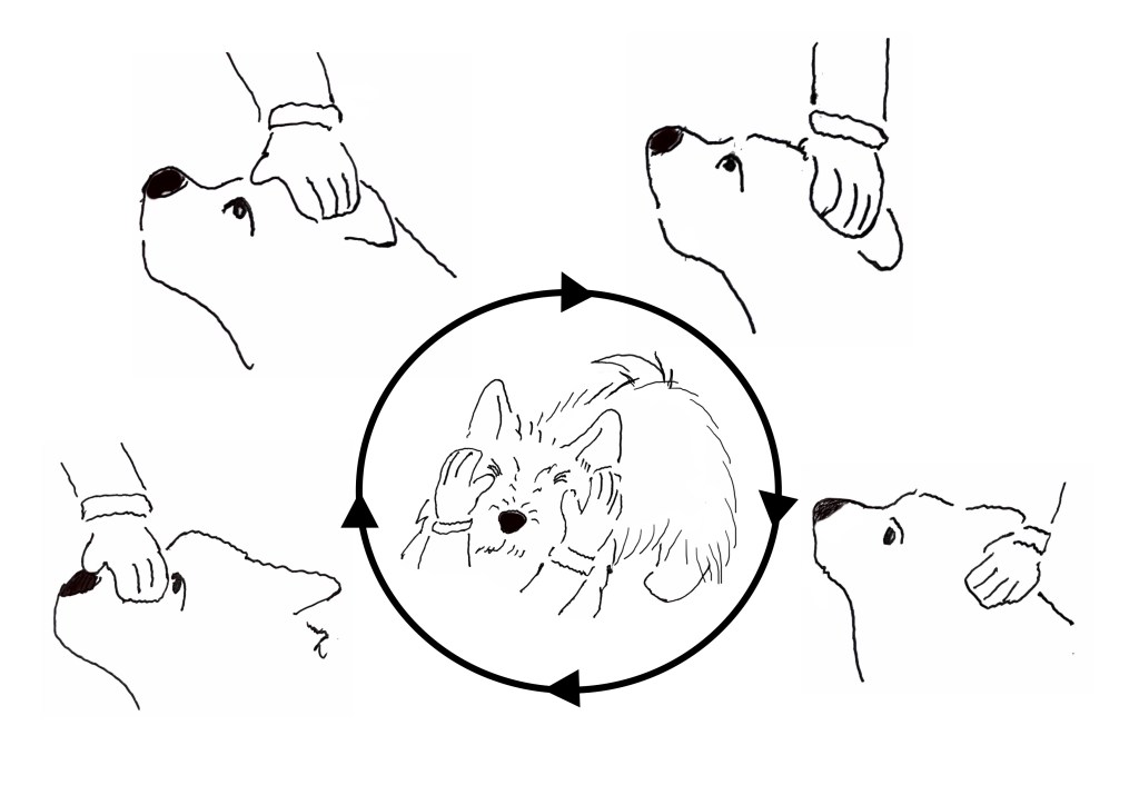 手順としては、こいぬのマズルから触り始めて頭頂部を経て後頭部へと触っている手を移動させます。