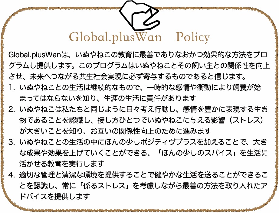 plusWanが行う生活マナー教室は、飼い主さんご自身で愛犬のしつけをすることで、いぬは飼い主への信頼が生まれ、注目するとともに落ち着いた性格形成へと導いていくことができます。